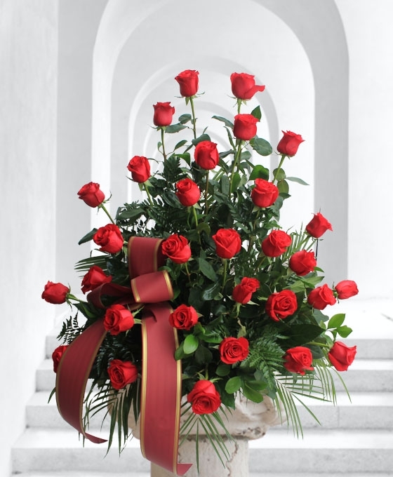 Elegante centro Funerario de 30 Rosas en color rojo. El citado centro para difunto puede variar de color según el gusto del cliente. Es un detalle serio y respetuoso que agradecerá la familia del fallecido. Son rosas de primera calidad y lleva unos verdes que dan luminosidad al trabajo. Nuestros proveedores son nacionales e internacionales.