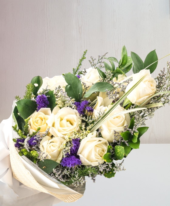 Bonito y fino Ramo Funerario 8 Rosas Blancas para entregar en los Tanatorios. Es un ramo funerario de flores variadas, en tonos blancos, confeccionado con rosas, limoniun azul y verdes variados que le dan al ramo funerario un toque dulce y delicado. Nuestros ramos de flores para funeral se envían a todos los Tanatorios de España como muestra de cariño, aprecio y acompañamiento para la familia de la persona fallecida.